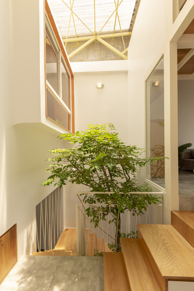 Căn nhà trẻ trung cho gia chủ hơi có tuổi. Mái tôn 2 lớp, vật liệu nhẹ nhàng phù hợp với kinh phí giới hạn mà vẫn hiệu quả về cách nhiệt và thẩm mỹ. Sàn được cắt sẻ, tách cao độ tạo ra các khoảng thông giữa các không gian, với mong muốn có một không gian thoáng, kết nối các thành viên gia đình với nhau.